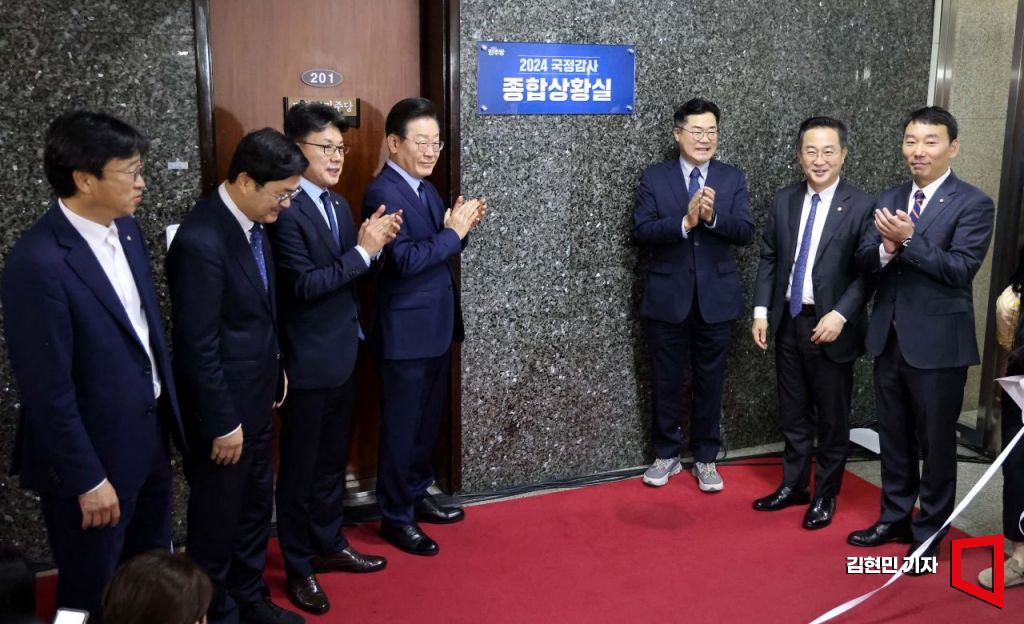 이재명 대표와 박찬대 원내대표 등 더불어민주당 지도부가 7일 국회에서 더불어민주당 국정감사 종합상황실 현판식을 하고 있다. 사진=김현민 기자 kimhyun81@