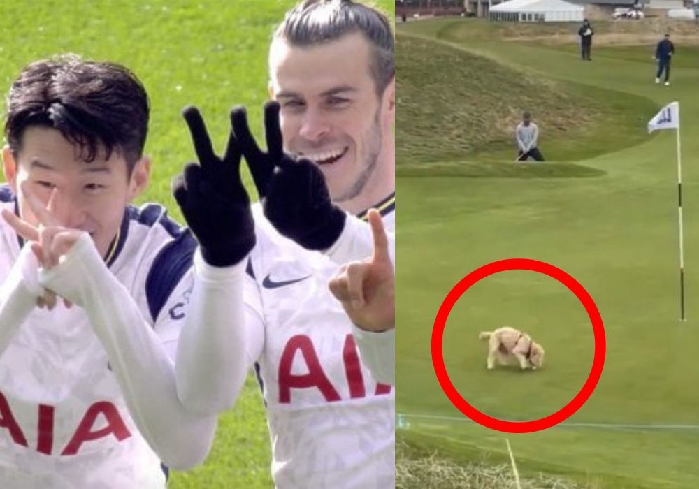 손흥민과 웨일스의 전 축구선수 개러스 베일(왼쪽)과 베일이 날린 공을 강아지가 물고 도망가는 모습. [사진출처=토트넘 홋스퍼 X 캡처, X 갈무리]