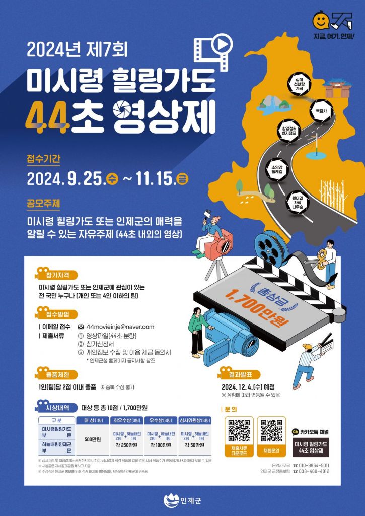 강원특별자치도 인제군(군수 최상기)은 7일, 지난 9월25일부터 접수를 받기 시작한 ‘제7회 미시령힐링가도 44초 영상제' 공모에 많은 관심이 쏟아지고 있다고 밝혔다. 이번 영상 공모전은 강원도 인제군을 관통해 미시령을 넘어 동해안 양양으로 향하는 국도 44·46호선 통행량 증대와 국도변지역 관광·경제 활성화를 위해 마련됐다.