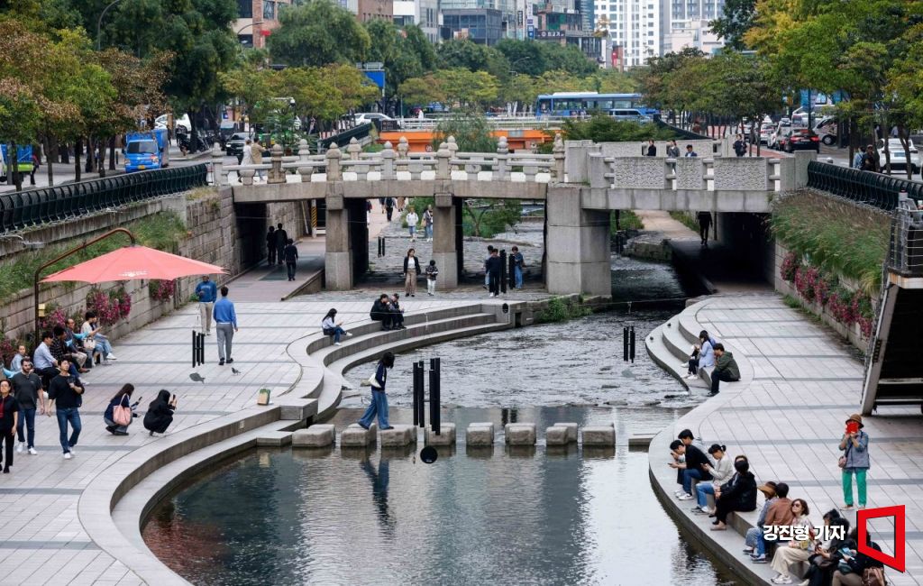 완연한 가을 날씨가 이어지고 있는 7일 서울 종로구 청계천을 찾은 시민들이 시원한 바람을 맞으며 가을의 정취를 만끽하고 있다.