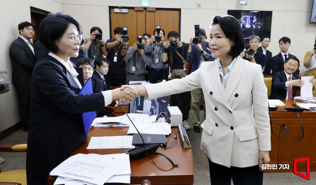 이진숙 방송통신위원회 위원장이 7일 국회 과학기술정보방송통신위원회에서 열린 방송통신위원회 등에 대한 국정감사에서 최민희 위원장과 악수하고 있다. 사진=김현민 기자 kimhyun81@