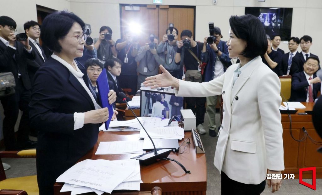 이진숙 방송통신위원회 위원장이 7일 국회 과학기술정보방송통신위원회에서 열린 방송통신위원회 등에 대한 국정감사에서 최민희 위원장과 악수하고 있다. 사진=김현민 기자 kimhyun81@
