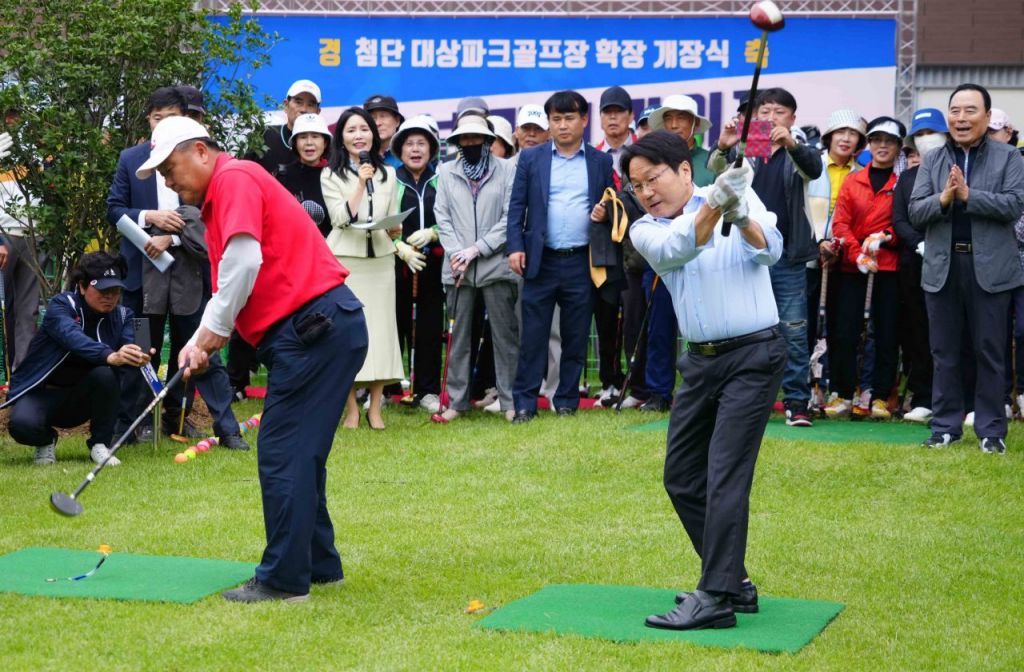 강기정 광주시장이 7일 오후 북구 첨단대상파크골프장 개장식에 참석, 내빈들과 시타를 하고 있다. [사진 제공=광주시]