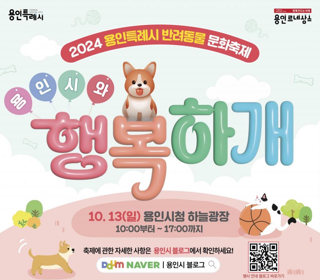 자세한 내용은 '2024 용인시와 행복하개' 블로그에서 확인할 수 있다. 블로그에서는 사전 이벤트인 '반려동물 이색 사진 콘테스트'도 접수한다.