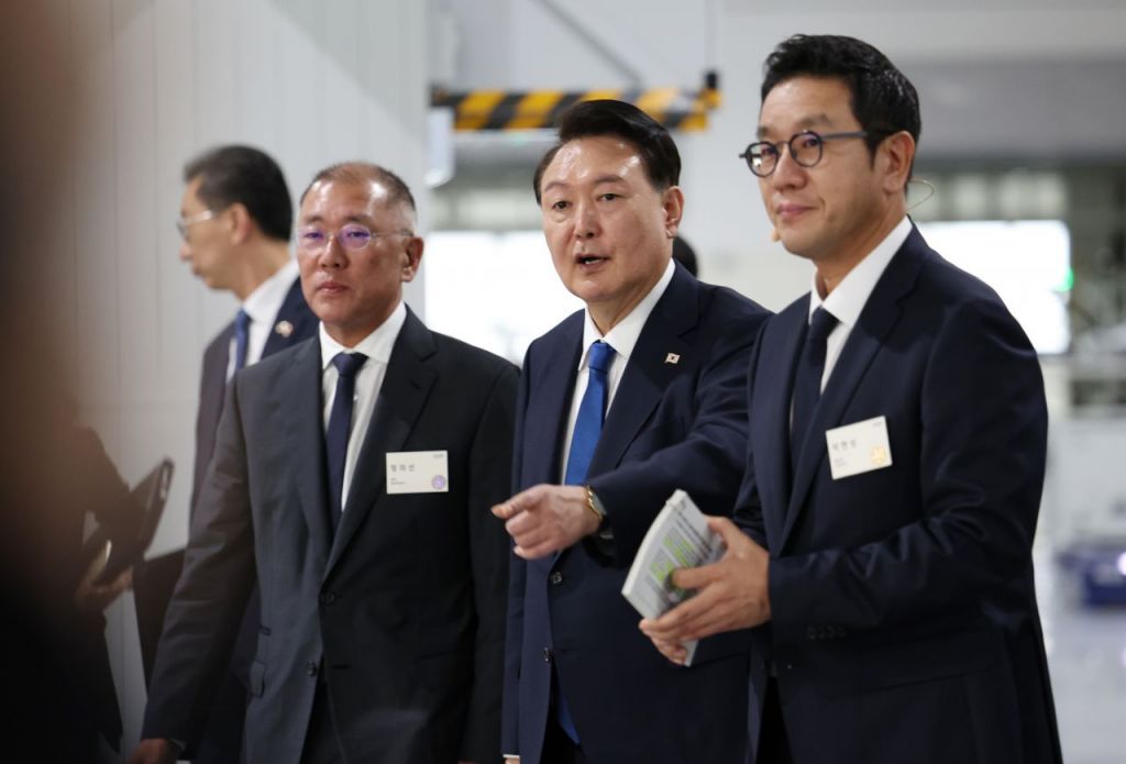 윤 대통령은 혁신센터에 도착해 정의선 현대차 회장의 안내에 따라 AI와 로봇이 주도하는 자율주행차 생산 공정을 시찰했다. 공장에서 생성된 데이터를 활용해 가상 공간에서 공장을 작동하고 관리하는 '디지털 트윈 공장'을 살펴보면서 임직원들과 의견도 나눴다.