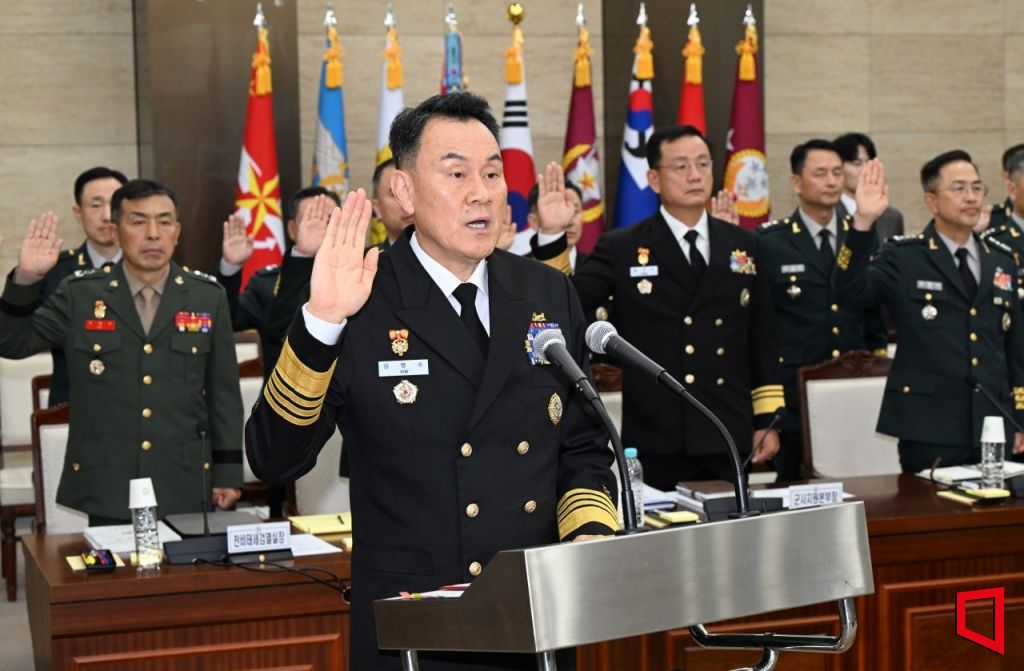 김명수 합참의장이 10일 서울 용산 합동참모본부에서 열린 국회 국정감사에서 증인 선서를 하고 있다. 사진=국회사진기자단