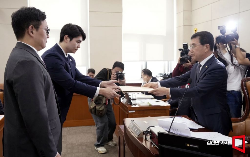 10일 국회에서 열린 행정안전위원회의 전체회의에서 신정훈 위원장이 명태균 씨와 김영선 전 국민의힘 의원에 대한 동행명령장을 경위에게 전달하고 있다. 사진=김현민 기자 kimhyun81@