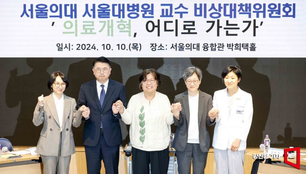 10일 서울 종로구 서울대 의과대학 융합관에서 열린 '의료개혁, 어디로 가는가' 토론회에 참석한 정부측 관계자와 서울의대 서울대병원 교수 비상대책위원회 관계자들이 사진촬영 하고 있다. 왼쪽부터 정경실 보건복지부 의료개혁추진단장, 장상윤 대통령비서실 사회수석비서관, 유미화 녹색소비자연대 상임대표, 강희경 서울대의대 교수비상대책위원장, 하은진 서울대의대 교수비상대책위원.