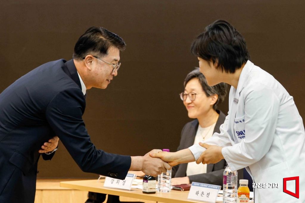 장상윤 대통령비서실 사회수석비서관과 하은진 서울대의대 교수비상대책위원이 10일 서울 종로구 서울대 의과대학 융합관에서 열린 '의료개혁, 어디로 가는가' 토론회에 참석해 악수하고 있다.