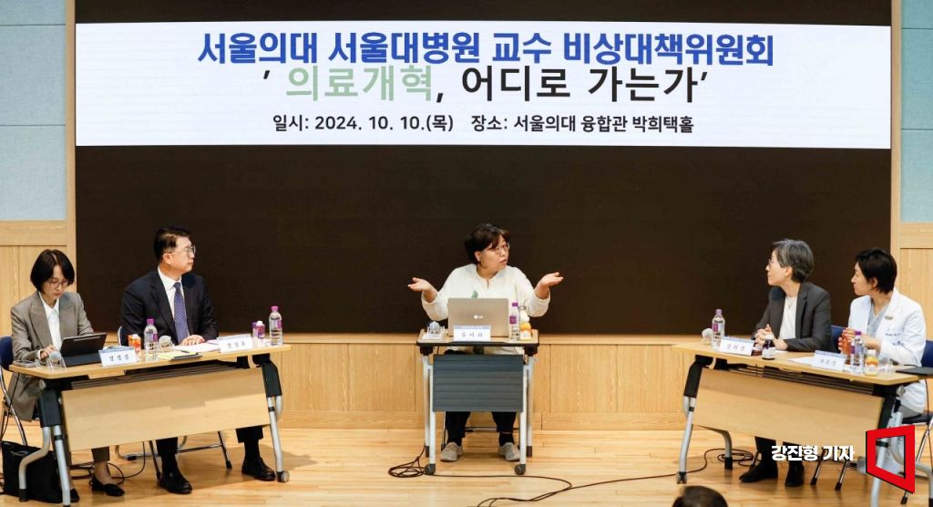 10일 서울 종로구 서울대 의과대학 융합관에서 열린 '의료개혁, 어디로 가는가' 토론회에 참석한 정부측 관계자와 서울의대 서울대병원 교수 비상대책위원회 관계자들이 의견을 나누고 있다. 왼쪽부터 정경실 보건복지부 의료개혁추진단장, 장상윤 대통령비서실 사회수석비서관, 유미화 녹색소비자연대 상임대표, 강희경 서울대의대 교수비상대책위원장, 하은진 서울대의대 교수비상대책위원.