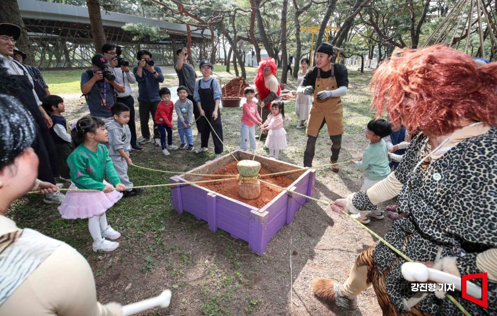 11일 서울 강동구 암사동 유적 일대에서 열린 '2024 강동선사문화축제'에 참가한 어린이들이 흙벽돌 만들기 체험을 하고 있다.