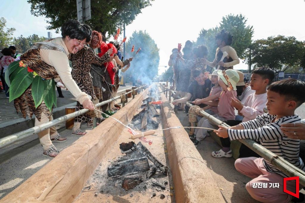 11일 서울 강동구 암사동 유적 일대에서 열린 '2024 강동선사문화축제'에 참가한 시민들이 선사바비큐 체험을 하고 있다.