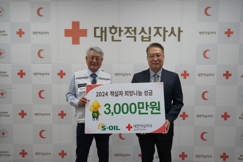 ‘적십자 성금’ 3000만원을 대한적십자사 울산지사에 전달한 S-OIIL.(왼쪽부터 채종성 적십자사 울산시지사 회장, 박성훈 S-OIL 부문장)