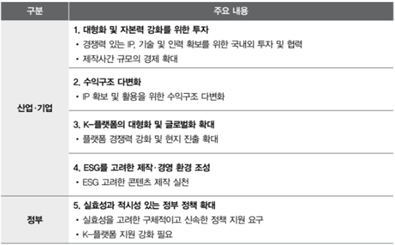 또한 ▲국내외 투자 및 제작사간 규모의 경제 확대 ▲콘텐츠 수익 구조 다양화 ▲환경·사회·지배구조(ESG)를 고려한 제작·경영 환경 조성 등도 콘텐츠 강화 방안으로 제시했다. 특히 토종 플랫폼의 경쟁력 강화와 해외 OTT와의 제휴를 통한 글로벌 진출 전략이 강조됐다.