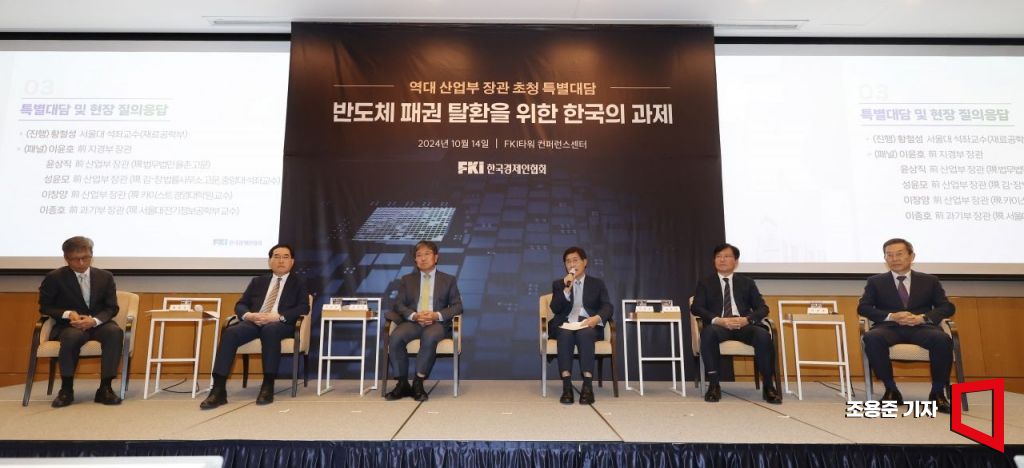 이윤호, 윤상직, 성윤모, 이챵양 전 산업부장관과 이종호 전 과기부 장관이 14일 서울 여의도 KEI타워 컨퍼런스센터에서 한국경제인협회 역대 산업부장관을 초청 특별대담에 참석, '한국의 반도체 산업 미래와 전략'이란 주제로 특별대담을 하고 있다. 사진=조용준 기자 jun21@