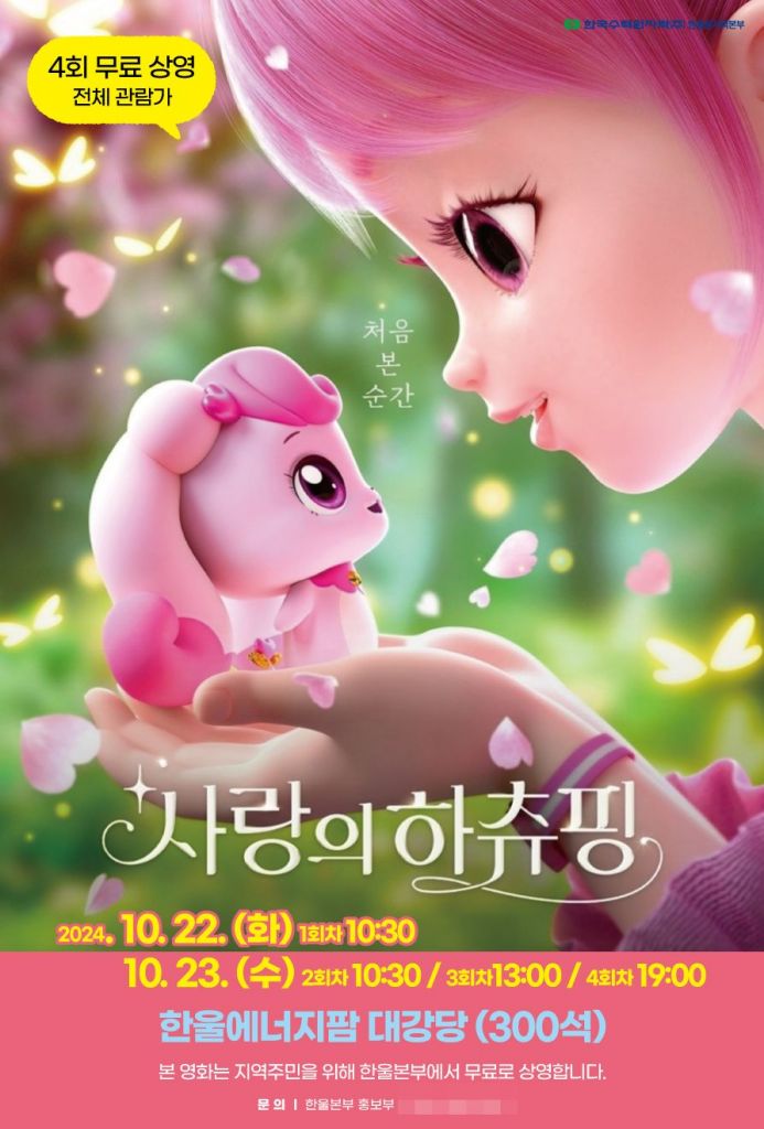 한국수력원자력 한울원자력본부(본부장 이세용)는 한울에너지팜 대강당에서 울진군민을 대상으로 영화 ‘사랑의 하츄핑’을 10월 22일, 23일 양일간 상영한다.