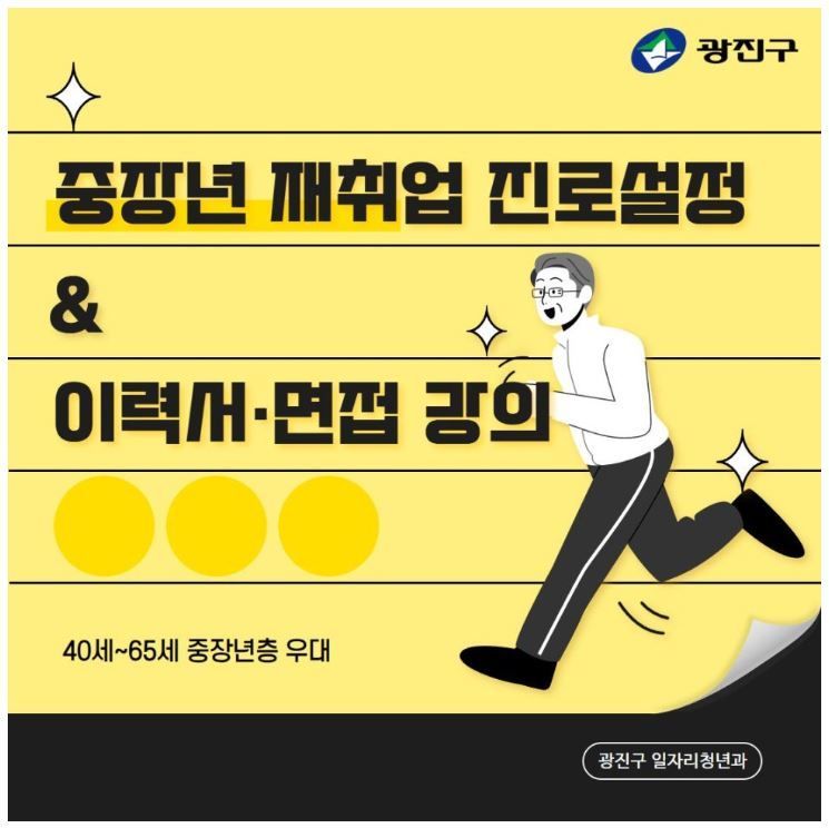 광진구(구청장 김경호)가 중장년층 취업 역량 강화를 위한 ‘재취업 진로 설정 & 이력서 면접 강의’를 운영한다.