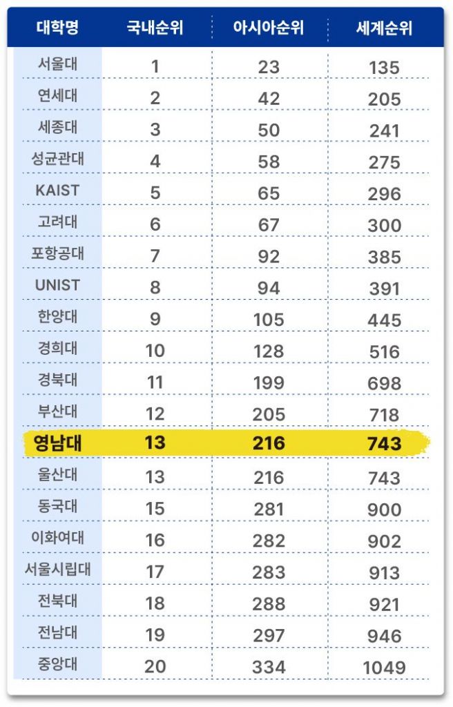 영남대학교(총장 최외출)가 ‘US뉴스&월드 리포트(U.S. News and World Report)’가 발표한 세계 대학 순위(2024-2025 Best Global Universities Rankings)에서 국내 13위에 올랐다. 지난해 18위에서 5계단 뛰어올랐다.