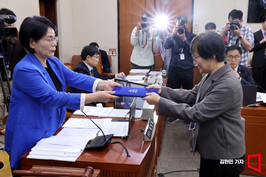권태선 방송문화진흥회 이사장이 14일 국회에서 열린 과학기술정보방송통신위원회의 한국방송공사(KBS)·한국교육방송공사(EBS)·방송문화진흥회에 대한 국정감사에서 최민희 위원장에게 선서문을 제출하고 있다. 사진=김현민 기자 kimhyun81@