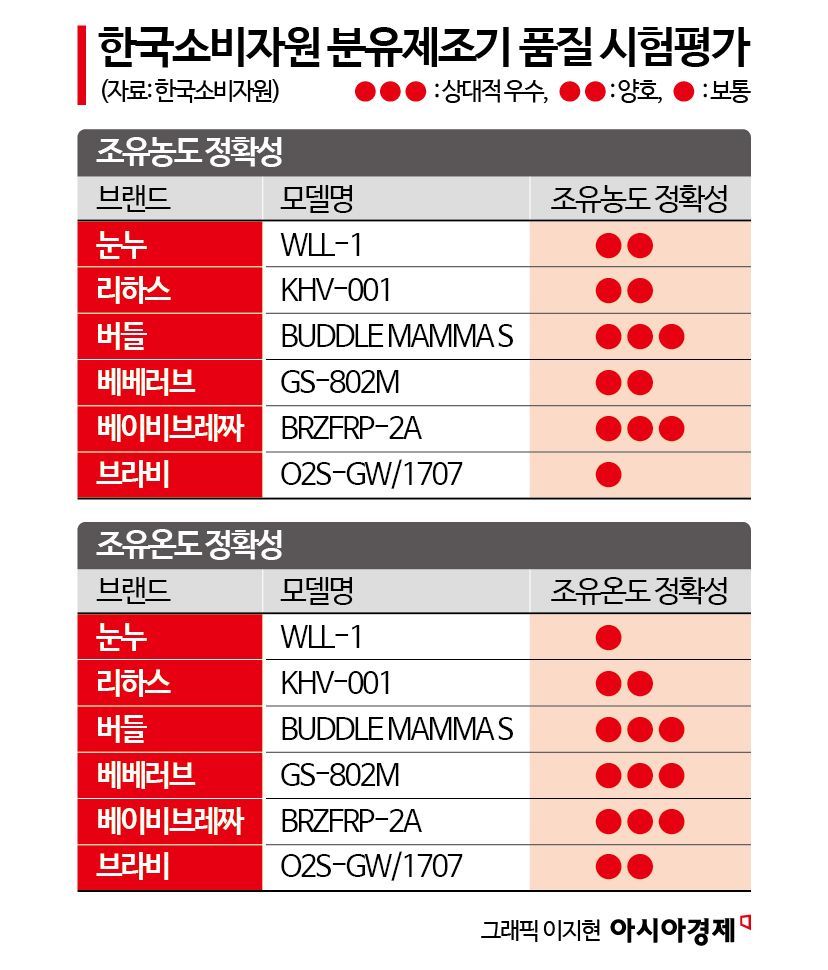 조유온도 정확성 시험에서는 버들, 베베러브, 베이비브레짜 등 3개 제품이 설정 온도 대비 1℃ 이내의 편차를 보였다. 리하스, 브라비 등 2개 제품은 '양호', 눈누 제품은 '보통' 수준으로 평가됐다.
