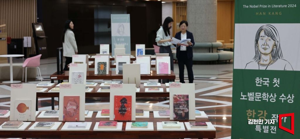 15일 서울 여의도 국회도서관 중앙홀에서 노벨문학상을 수상한 한강 작가의 책이 전시되고 있다. 국회도서관은 한국 문학의 새로운 역사를 쓴 한강 작가의 노벨문학상 수상을 기념하고자 이날부터 약 2개월간 ‘한국 첫 노벨문학상 수상 한강 작가 특별전’을 개최한다. 사진=김현민 기자 kimhyun81@