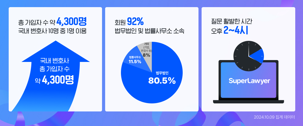 지난 7월 출시된 슈퍼로이어는 지난 9일 기준 약 4300명의 가입자를 확보했다. 이는 국내 전체 변호사 수 3만5938명의 약 12%다. 전체 회원 가운데 80.5%는 법무법인 소속 변호사였으며, 법률사무소 소속 변호사는 11.5%였다. 기업 변호사와 판·검사 등 기타 회원의 비중은 8%로 확인됐다.