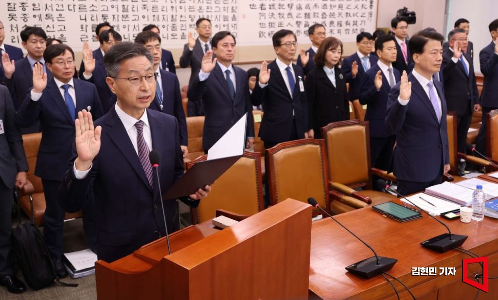 최재해 감사원장이 15일 국회에서 열린 법제사법위원회의 감사원에 대한 국정감사에서 증인선서를 하고 있다. 사진=김현민 기자 kimhyun81@