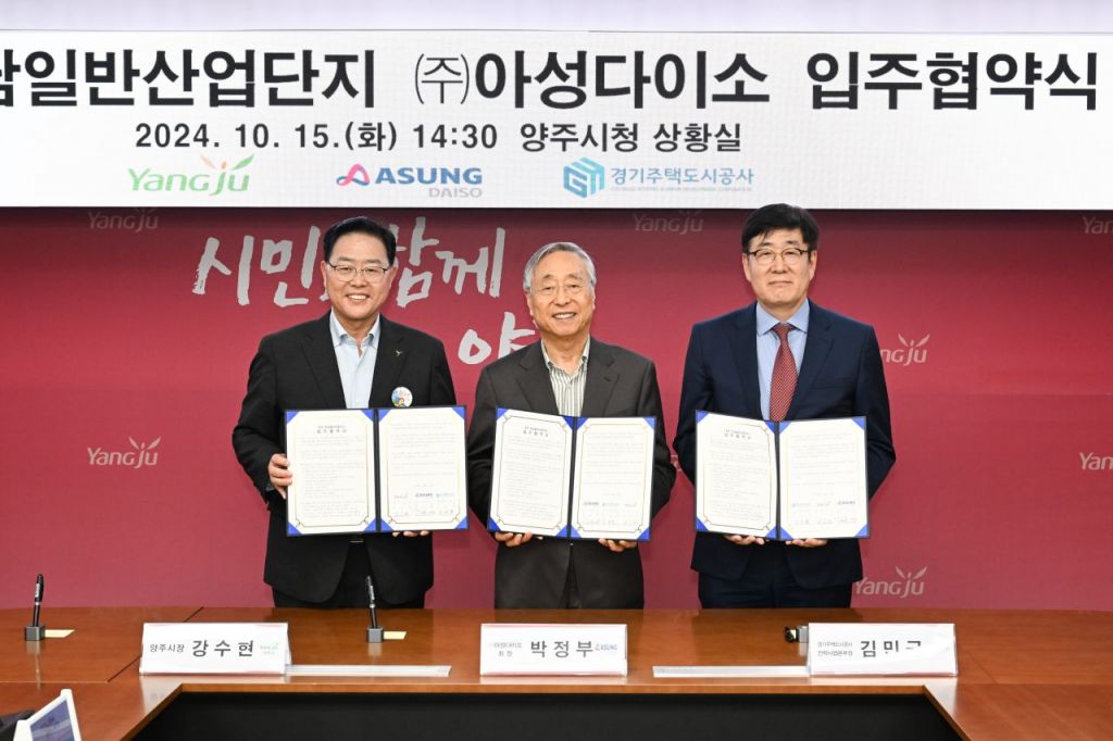 경기 양주시(시장 강수현)가 15일 (주)아성다이소와 은남일반산업단지 입주 협약을 체결하며 ‘아성다이소 양주허브센터’ 설립을 확약했다.