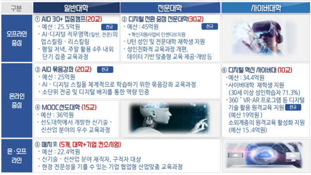 교육부는 일반대학·전문대학·사이버대학을 대상으로 AID 선도대학 100개교를 육성하기로 했다. 100개교는 기능별로 나뉜다. 예를 들어 일반대 20곳은 '집중캠프'가 되어 30~40대 학습자를 대상으로 평일 저녁과 주말 등 AID 업스킬링 교육과정을 운영한다. 전문대 30곳은 '디지털 전환 중심 전문대학'으로 지정돼 온·오프라인으로 시공간 제약 없이 AID 역량을 기를 수 있는 강좌를 개발 및 운영한다. 이 밖에도 온라인 중심의 AID 묶음강좌 20개교, MOOC 선도대학 15개교, 디지털 혁신 사이버대 10개교 등에 예산을 지원한다.