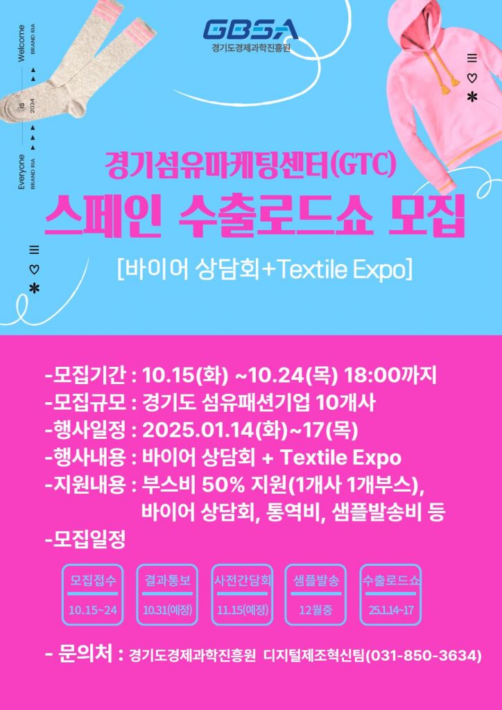 경기도경제과학진흥원이 내년 1월 14~17일 개최되는 ‘2025 스페인 Textile Expo Barcelona’에 참가할 기업을 모집한다.