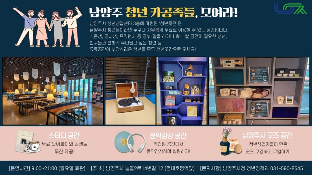 시는 이번 개선 사업을 통해 △음악 감상 △스터디 △굿즈 관련 공간 등을 마련함으로써 청년들이 턴테이블로 엘피(LP)를 감상하고, 무료 와이파이·콘센트 등 완비된 학습 환경에서 공부하며, 남양주시 굿즈를 보고 구입할 수 있도록 했다.