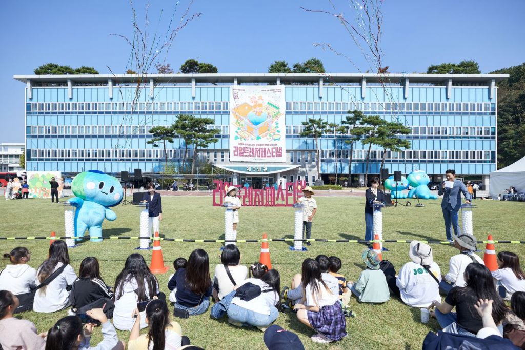 경기도가 마련한 세계 최대 규모 보물찾기 ‘리얼 트레저 페스티벌’에 참가한 사람들이 잔디밭에 앉아 설명을 듣고 있다.