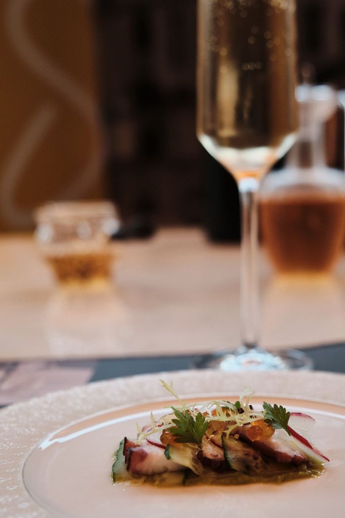 다음으로 첫 번째 코스 '스파클링 다즐링'이 테이블 위에 올랐다. '티의 샴페인'이라 불리는 인도의 다즐링은 심한 일교차와 짙은 안개로 인한 높은 습도, 고른 강우량 등이 더해진 환경에서 재배돼 독특하고 섬세한 풍미를 만들어냈다. 다즐링은 스리랑카 우바, 중국 기문과 함께 세계 3대 홍차로 꼽히기도 한다. 이 소믈리에는 "티의 샴페인이라는 별칭처럼 청량감을 느낄 수 있도록 다즐링을 8시간 이상 냉침한 뒤 탄산을 더해 차를 내고 있다"고 말했다. 스파클링 다즐링과 함께 나온 '문어 세비체'는 문어와 해초가 상큼한 소스와 어우러져 청량한 맛의 차와 잘 어울렸다.
