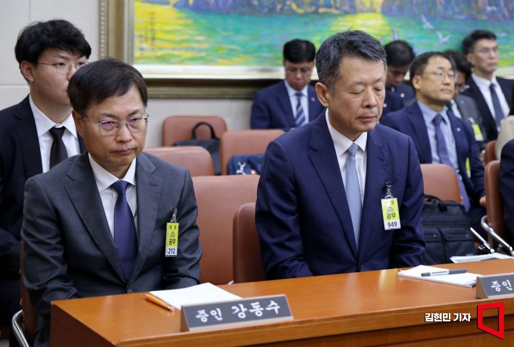 김광일 MBK파트너스 부회장(오른쪽)과 강동수 SK이노베이션 부사장이 17일 국회 정무위원회에서 열린 금융감독원·서민금융진흥원에 대한 국정감사에 출석해 있다. 사진=김현민 기자