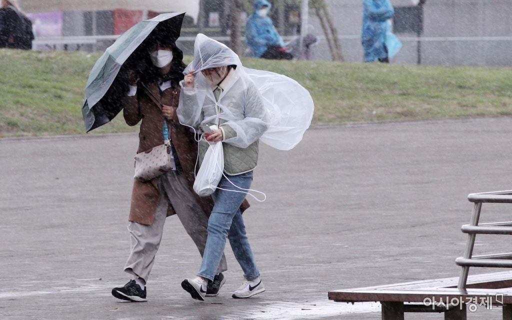 10일 서울 반포한강공원에서 시민들이 갑자기 불어온 비바람에 우산과 비옷을 움켜쥔 채 걷고 있다./김현민 기자 kimhyun81@