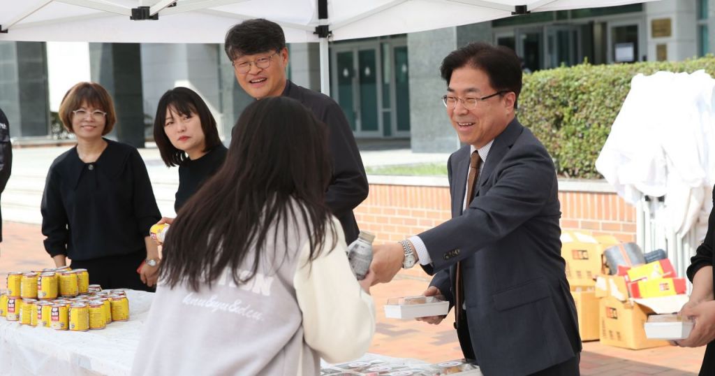 성한기 총장과 총학생회, NH농협 경북 경산시지부 관계자가 함께 교내 중앙도서관 광장에서 중간고사 시험을 앞둔 학생들에게 떡과 식혜, 캔커피 등 각 400개를 응원의 인사와 함께 전달했다.