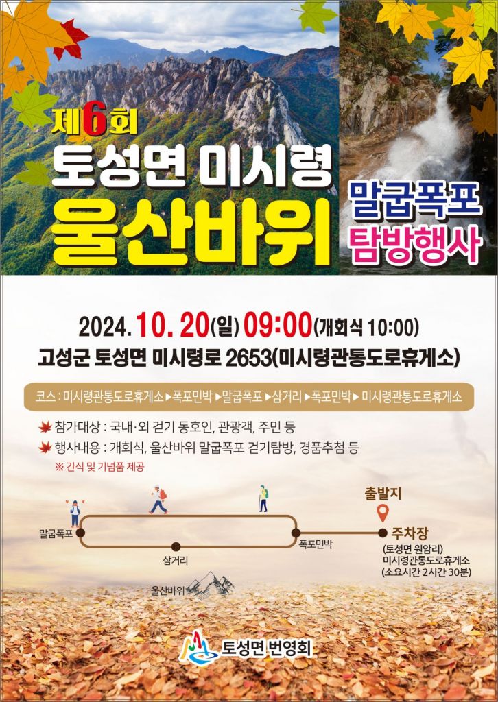 행사 코스는 토성면 원암리 미시령관통 도로 휴게소에서 출발하여 폭포민박을 거쳐 말굽폭포까지 왕복 약 5㎞(2시간 30분 소요)의 구간으로 구성되어 있으며, 하나둘씩 물드는 단풍을 감상하며 걷는 특별한 시간이 될 것으로 기대된다.