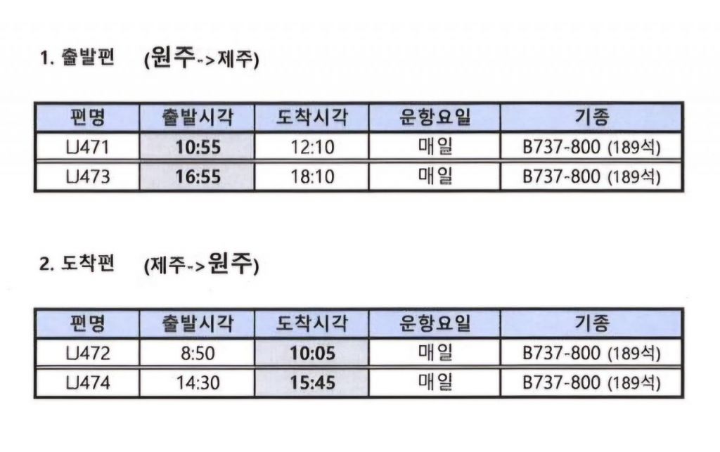 원주공항에 취항한 진에어의 동계 항공기 운항 일정이 국토교통부의 최종 승인으로 확정됨에 따라, 원주∼제주 노선이 종전과 같이 오전·오후 시간대로 편성 유지되어 2025년 3월 29일까지 적용된다.