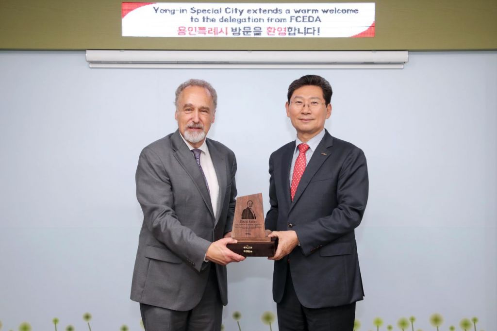 이상일(오른쪽) 용인시장이 17일 시청을 방문한 데이비드 켈리 미국 버지지아주 페어팩스카운티 경제개발청 부청장에게 기념패를 전달하고 있다. [사진제공=용인시]
