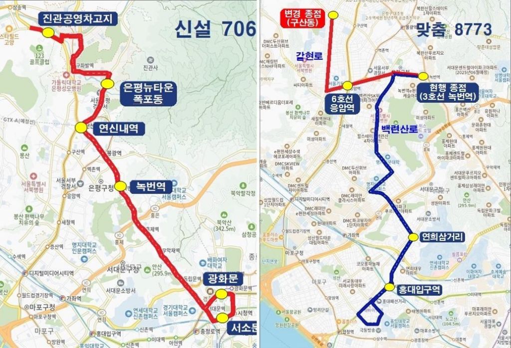 서울 은평구(구청장 김미경)는 시내버스 혼잡 해소 등 이용 편의 증진을 위해 18일부터 시내버스 706번 노선을 신설하고, 맞춤버스 8773번 노선을 연장해 운행한다고 밝혔다.
