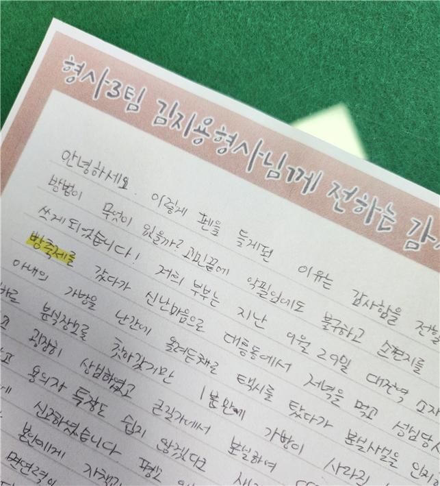 이후 경찰서에는 손글씨로 빼곡히 쓰여진 감사 편지가 전달됐다. 이는 A씨가 김 형사에게 쓴 편지로, A씨는 '가방을 찾아주셔서 감사합니다. 형사님 같은 분들이 많아진다면 정말 아름다운 대한민국이 될 것 같다'고 밝혔다.