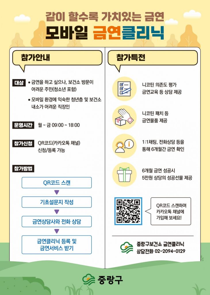 모바일 금연클리닉은 카카오톡 채널에 ‘중랑구 보건소 모바일 금연 클리닉’을 검색하거나 QR코드를 스캔하여 이용할 수 있다. 카카오톡 채널에서는 금연 클리닉 등록부터 1:1 맞춤형 채팅과 전화상담 서비스 등이 제공된다.