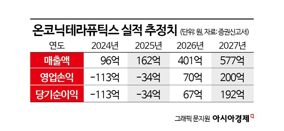온코닉테라퓨틱스는 올해 당기순손실 113억원을 기록하고 2026년 흑자 전환할 것으로 내다봤다. 2026년과 2027년 당기순이익 추정치로 각각 67억원, 192억원을 제시했다. 지난 1일 국내에 출시한 자큐보정 매출이 올해 96억원에서 2027년에는 577억원으로 성장할 것이라고 설명했다.