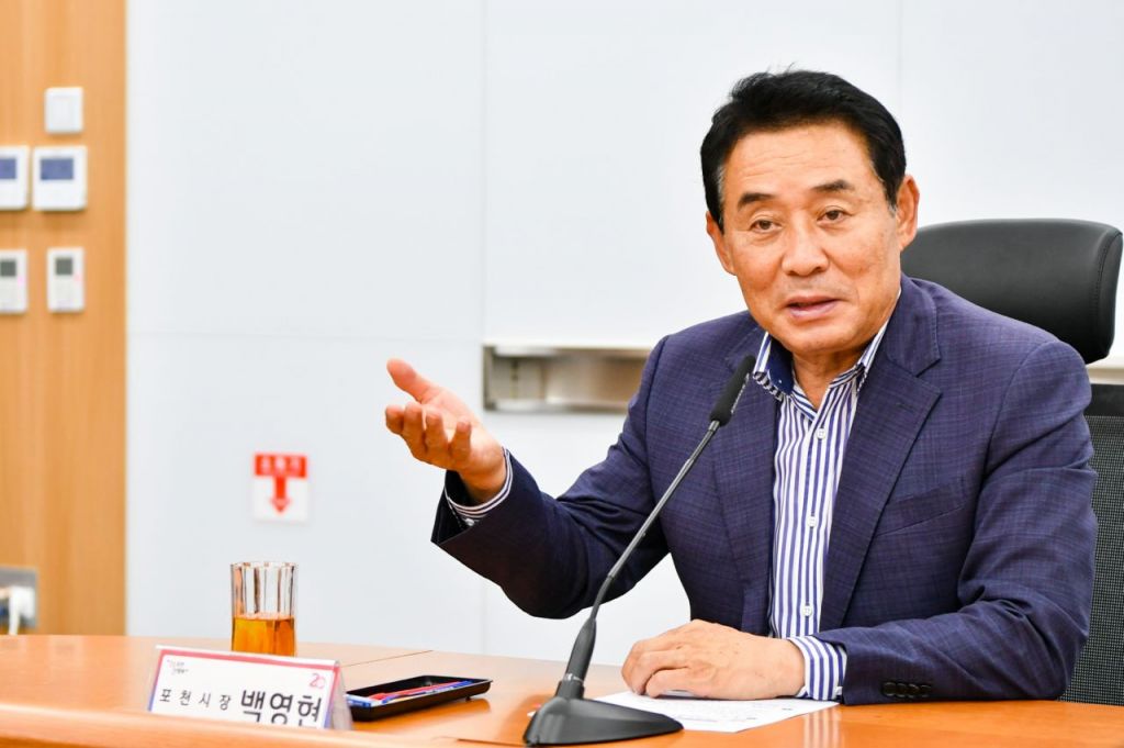 백영현 포천시장은 지난 17일 포천시청 시정회의실에서 ‘선행하기 좋은 날, 포천시 천사데이’ 이웃돕기 기탁식을 진행하고 있다. <사진=포천시>
