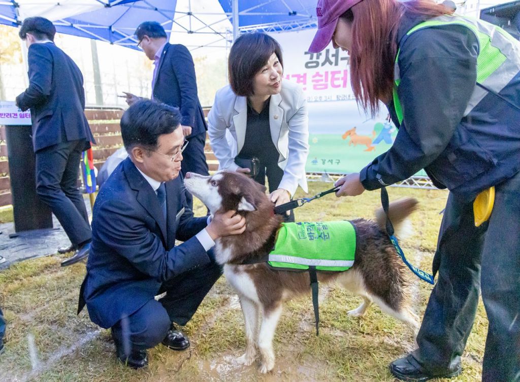 진교훈 서울 강서구청장(왼쪽)이 황금내근린공원에 조성된 반려견 쉼터 개장식에서 반려견과 인사를 나누고 있다. 강서구 제공.