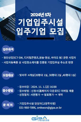 경기 고양산업진흥원(원장 한동균)은 첨단산업 분야의 기업을 대상으로 오는 11월 1일까지 기업입주시설 신규 입주기업을 모집한다고 18일 밝혔다.