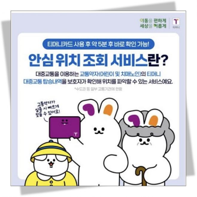 서비스 대상자는 어린이(만 6~12세)와 치매노인(만 65세 이상)이며, 이용 방법은 티머니카드&페이 홈페이지에서 회원 가입 및 안심 위치 조회 서비스를 신청, 등록하면 된다. 보호자와 법정대리인은 어린이 및 치매노인 실종 시 티머니 홈페이지에서 즉시 승하차 교통수단, 노선, 시간 등 교통카드에 등록된 실시간 대중교통 탑승내역을 조회할 수 있다. 모바일·실물 티머니 카드 및 서울시 어르신 교통카드 등 티머니에서 발급한 교통카드 내역만 조회 가능하다.