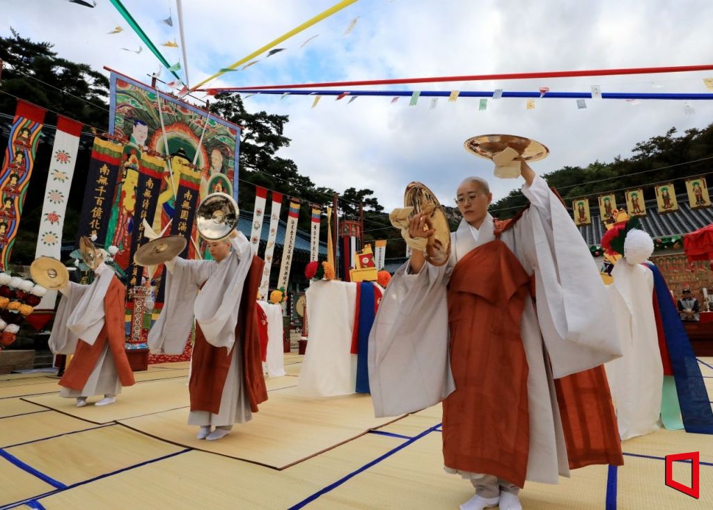 20일 서울 은평구 진관사 대웅전 야단법석에서 ‘수륙재 개건 626주년 기념 2024 진관사 국행수륙재’가 봉행됐다. 비구니 스님들이 국가와 국민을 위해 헌신하다 희생한 군인,경찰,소방 공무원 등 제복공무원들의 넋을 기리고 국민들의 평안과 건강을 기원하며 천수바라 춤을 추고 있다. 수륙재는 국가의 안녕과 국민의 평안을 기원하는 불교의식으로 국가무형유산으로 지정되어 있다. 사진=진관사