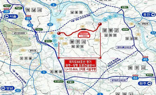 국지도 88호선 ‘경기 광주-양평 도로건설공사’는 광주시 퇴촌면 광동리부터 양평군 강하면 운심리로 연결되는 기존 도로를 개량하고자 총 연장 10.4㎞ 구간에 터널(480m)과 교량 4개소(305m)를 설치하고 굴곡부를 직선화하는 사업이다. 내년 3월 터널 공사를 시작으로 2029년 준공 목표다.