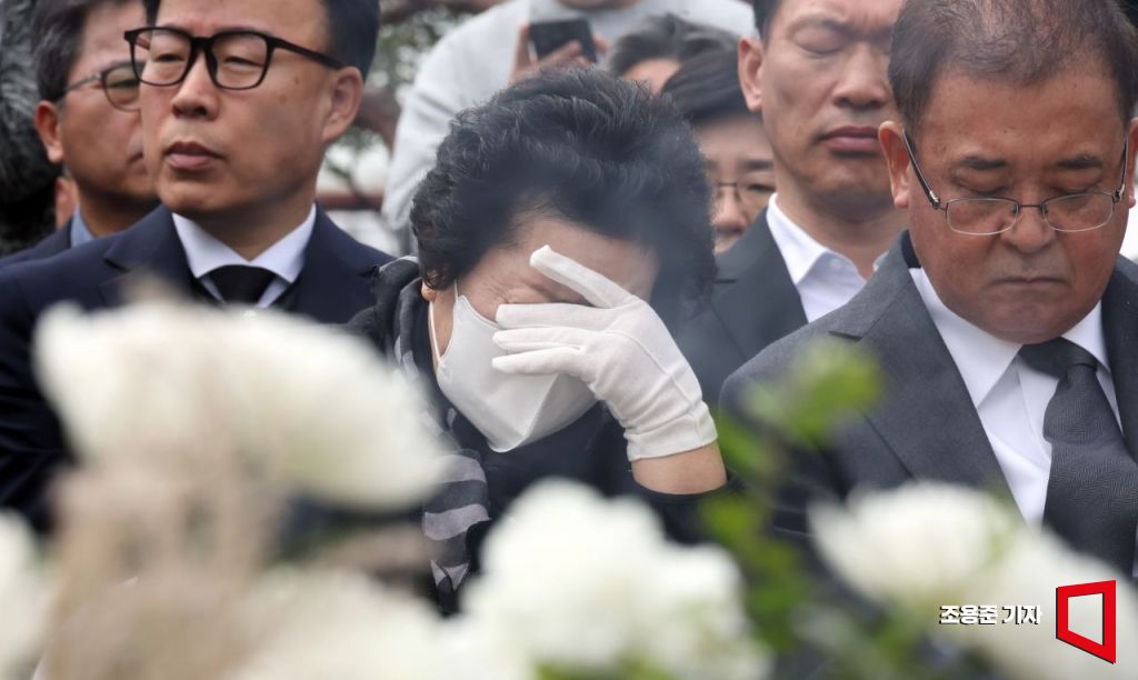 21일 서울 성수대교 북단 위령탑 앞에서 열린 성수대교 붕괴사고 30주기 합동위령제에 참석한 유가족들이 눈물 흘리고 있다. 사진=조용준 기자